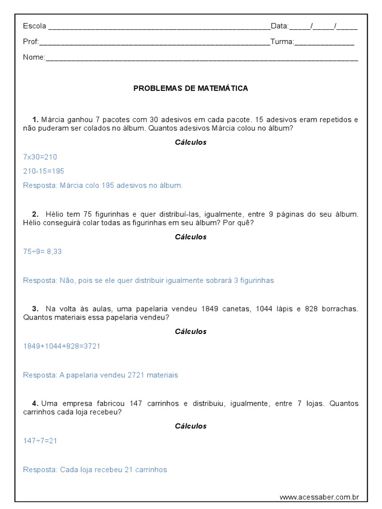 Estas atividades de matemática podem ser baixados em word (modelo que pode ser editado), em pdf (pronto para imprimir) e também a atividade respondida.