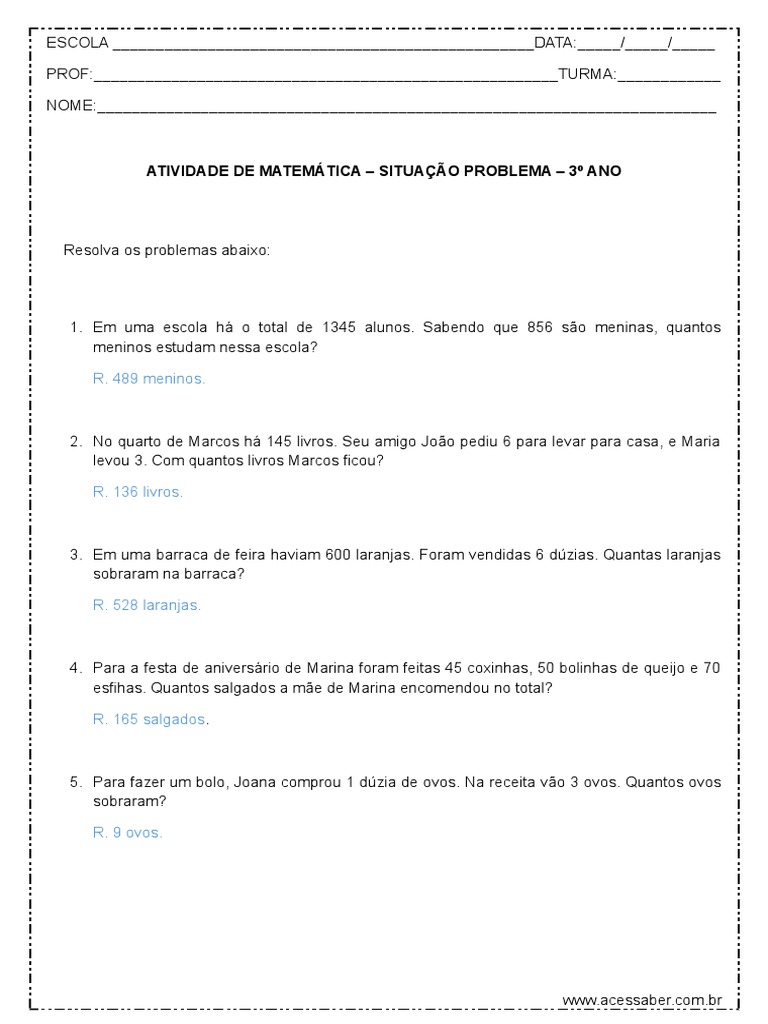 8º ano situações problema de matemática: Atividades excelentes para o terceiro ano. Você está dando aulas para uma turma de 1º ano do ensino e precisa se atividades e exercícios de qualidade para imprimir e aplicar em sala de aula? Aceste indicații dispar în timpul testului sau a temei.