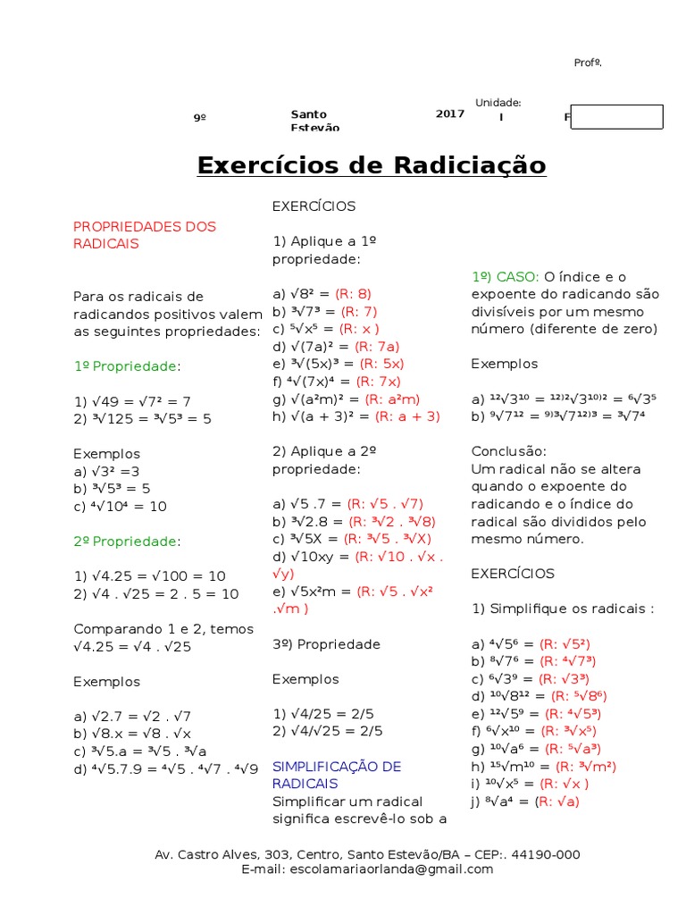 Lista De Exercicio Radiciacao 9º Ano 2017 Gabarito Pdf Algebra Ensino De Matematica